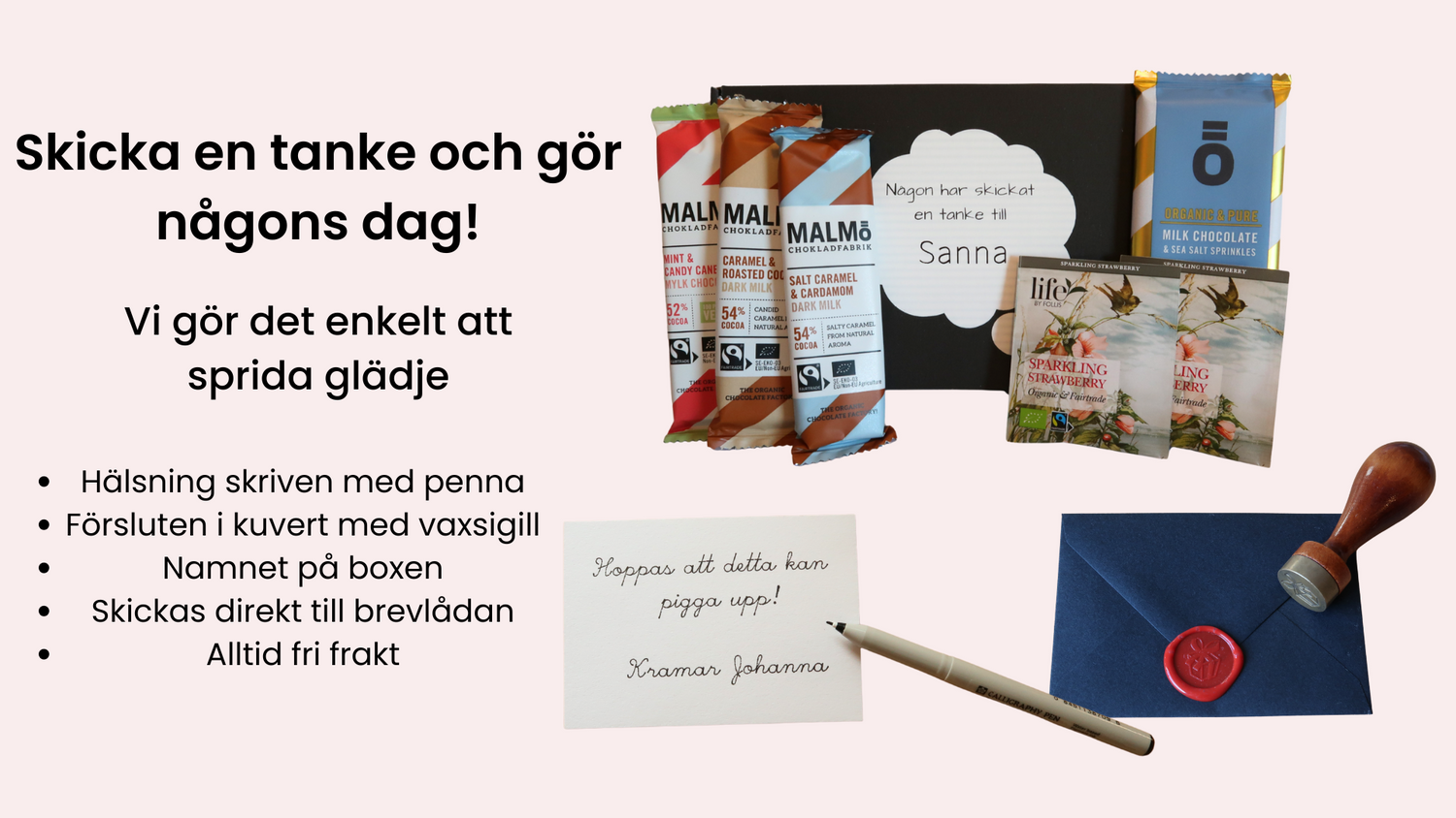 Varje presentbox innehåller inte bara godis utan även omtanke: vi paketerar fint, skriver din hälsning med penna och kan till och med lägga till foto eller extra gåvor. Allt för att din present ska kännas personlig och minnesvärd.