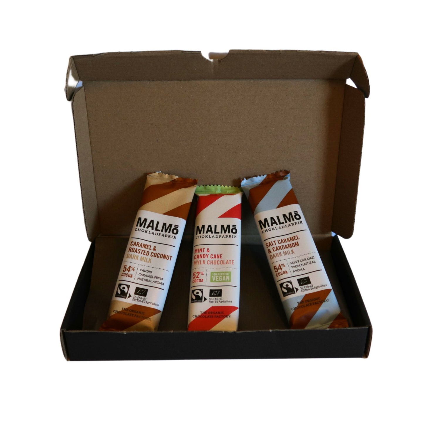 Perfekt för chokladälskaren, denna box innehåller tre unika chokladbitar från Malmö Chokladfabrik.