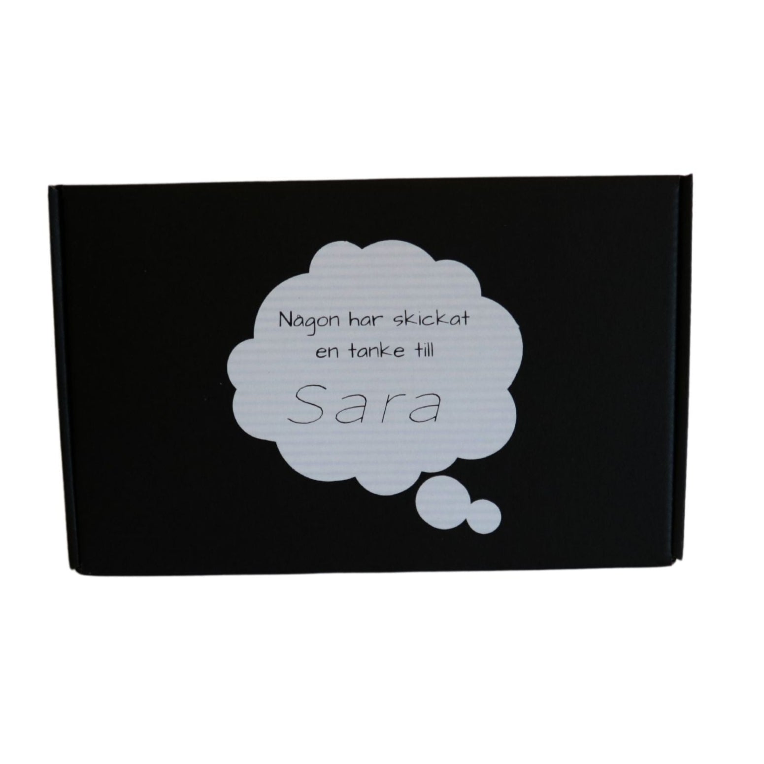 - Vi personaliserar även utsidan! Mottagarens förnamn skrivs på boxen, så att redan paketet som dimper ner i postlådan känns personligt. Att se sitt eget namn på boxen bygger förväntan och gör att man känner sig riktigt utvald innan man ens öppnat den.